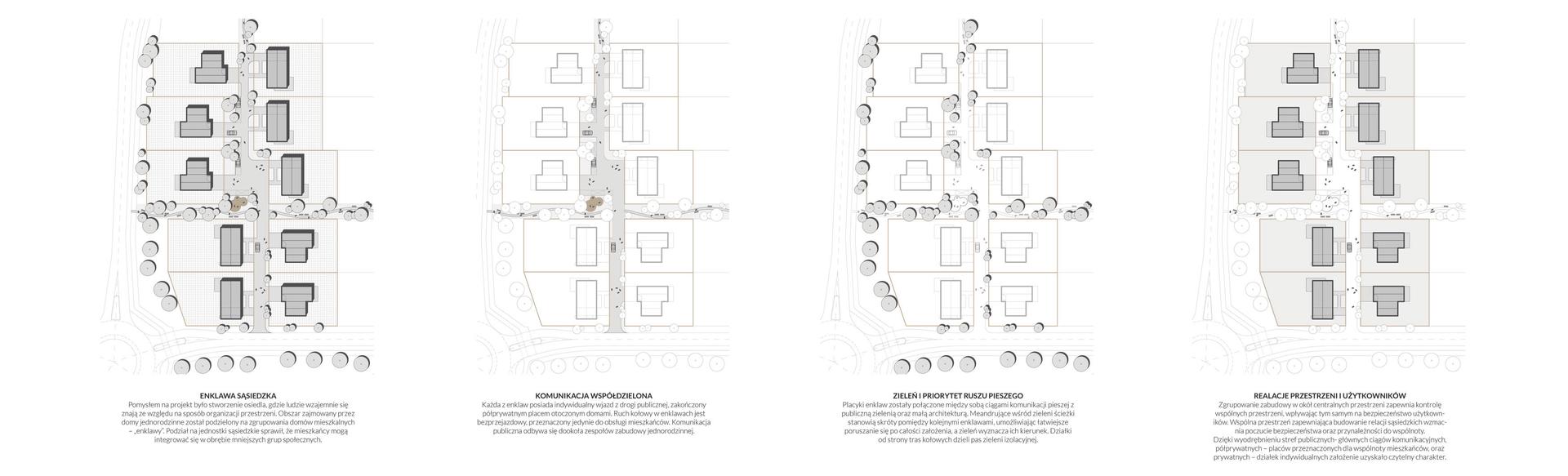 Każda z enklaw posiada indywidualny wjazd z drogi publicznej, zakończony półprywatnym placem otoczonym domami. Placyki enklaw zostały połączone między sobą ciągami komunikacji pieszej z publiczną zielenią oraz małą architekturą. Ruch kołowy w enklawach jest bezprzejazdowy, przeznaczony jedynie do obsługi mieszkańców.