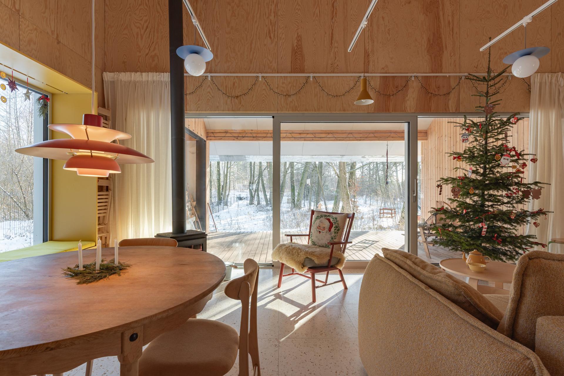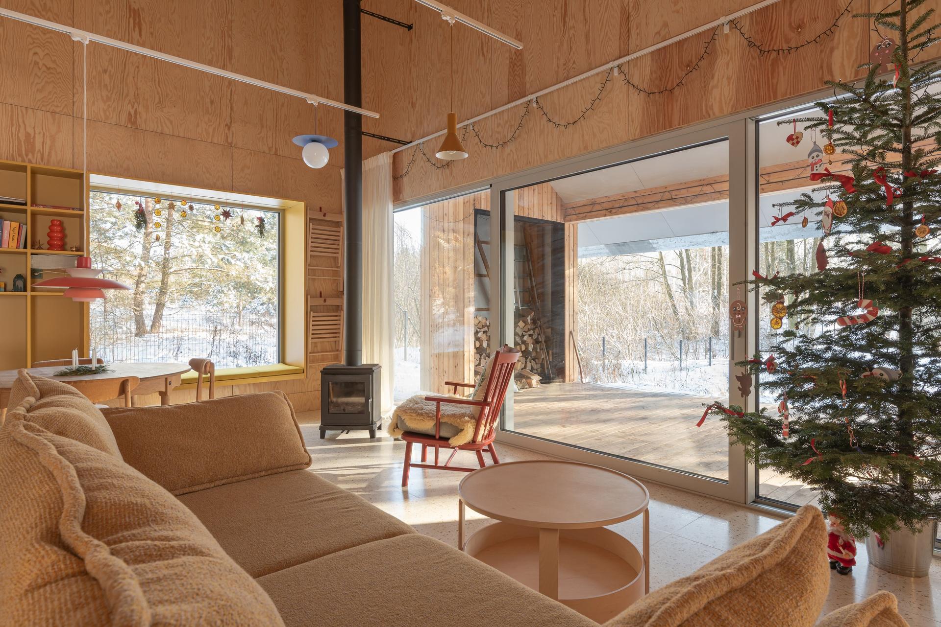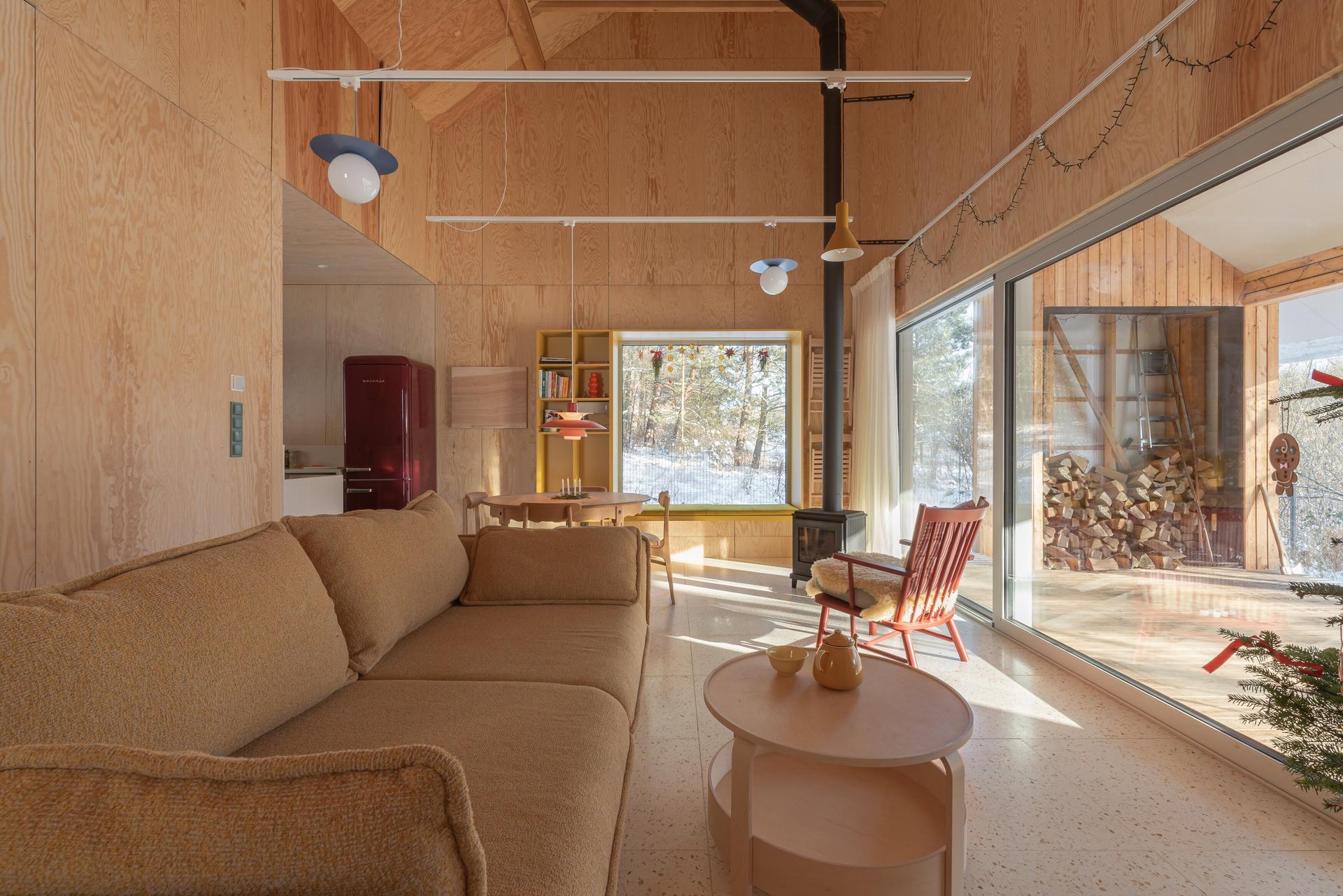 Na niewielkim planie udało się zrealizować program funkcjonalny składający się z 3 sypialni, części dziennej z wnęką kuchenną wraz z pomieszczeniami obsługującymi. Przed wejściem do domu znajduje się jedno z dwóch rozcięć bryły, wychodzące na pobliskie jezioro. Zarówno ono, jak i zadaszony taras pełnią rolę przedłużenia przestrzeni wewnętrznej na zewnętrze, które spajają płaszczyzny dachu.